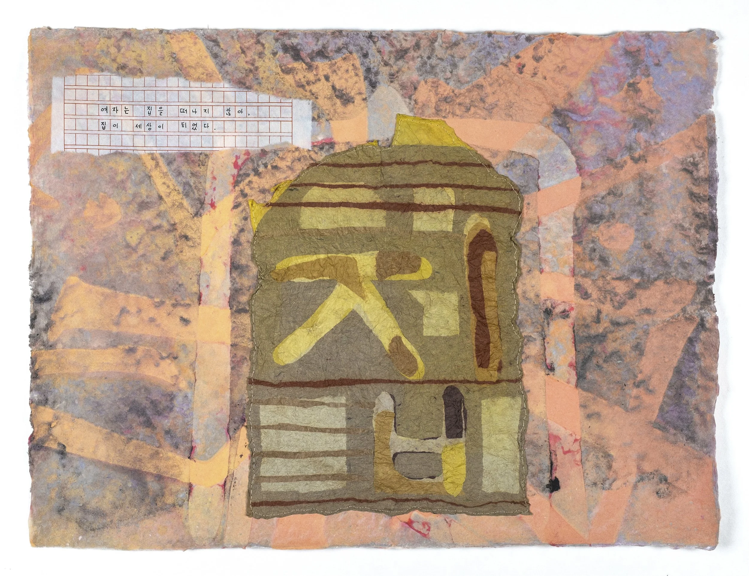 To Be Married, in Two Tongues, Handmade paper, collage, Joomchi paper, sewing, screenprint on Hanji, 18 x 24 in, 2025